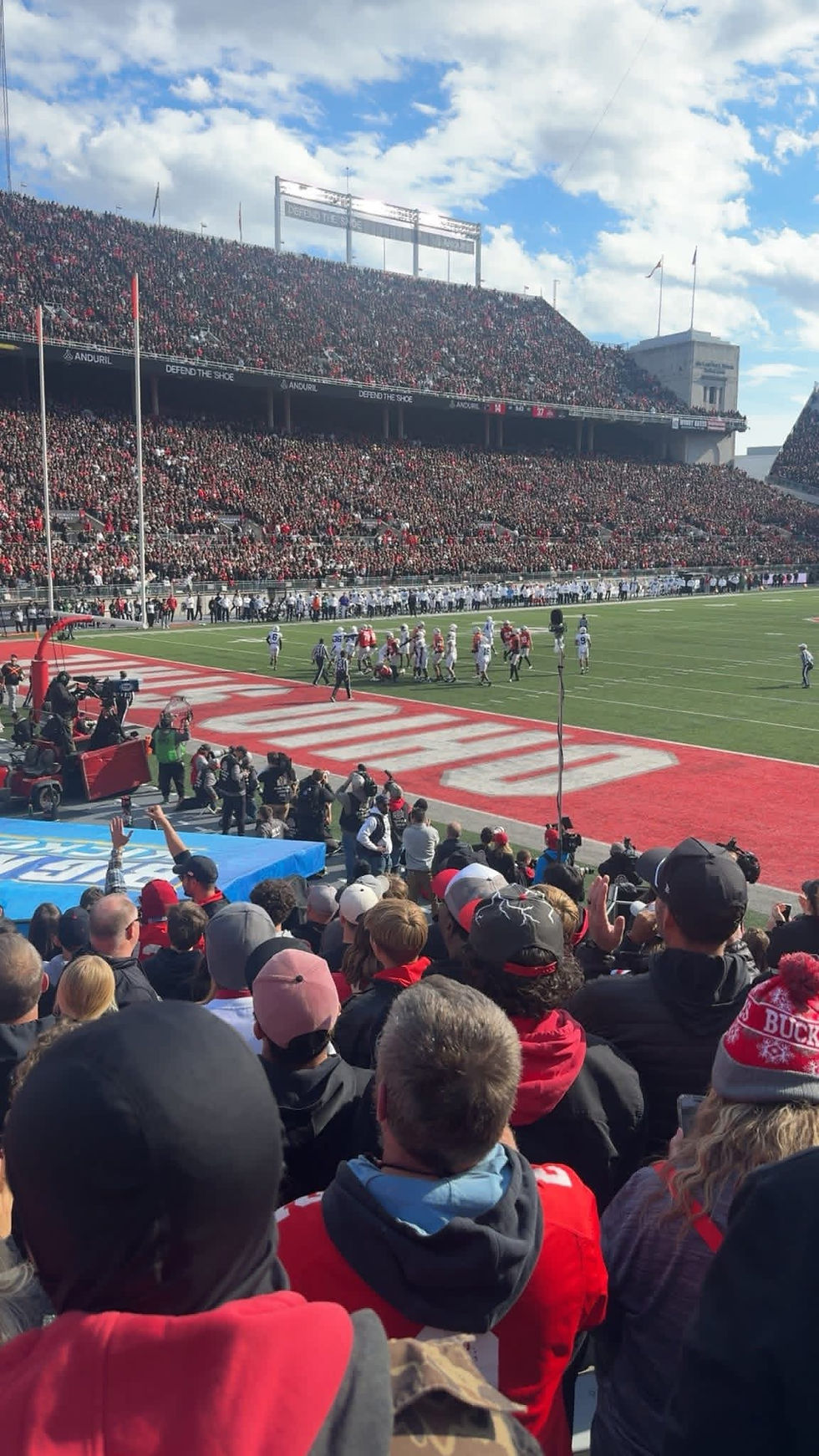Ohio stadium was rocking on November 1st as the Buckeyes took on the Nittany Lions. Before the game started, Brutus jumped off a building and ziplined to the field. The Lions got the ball first, but Ohio State's defense stopped them forcing them to punt. Ohio State's first drive ended with a touchdown after Juilan Sayin threw a 14 yard touchdown pass to Jeremiah Smith. The Lions second drive couldn't get going as they punt again. Ohio State's second drive in the second quarter ending in a 22 yard field goal by Jayden Fielding. Penn State would punt the next drive. Ohio State drive would end with a Juilan Sayin 43 yard touchdown pass to Carnell. Penn State would punt after their drive stalled. Ohio State would fumble leading to Penn State to finally get on the board with a 3 yard touchdown run by Nicholas Singleton. Ohio State would fumble on the first play of their next drive leading to another Penn State score by Kaytron Allen as we head into halftime; score 17-14 Ohio State.